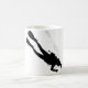Diese Tasse wird mit einer Silhouette eines UNTERWASSERATEMGERÄT-Tauchers verziert, der zu einer größeren Tiefe absteigt, die einen Strom der Blasen schleppt.