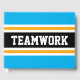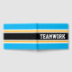 Dieses farbenfrohe, sportliche Design beinhaltet sportliche TEAMWORK-Texte in einem breiten schwarzen, horizontalen Mitte-Rennstreifen mit leuchtend goldgelben und weißen Streifen gegen hellblaue Außenrandstreifen. Die Farben und Texte in diesem Design können personalisiert sein.