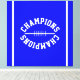 This sporty design features white mirrored bold CHAMPIONS white text in the shape of a football centered against vivid royal blue background with white vertical end zone edge stripes. The colors in this design can be personalized.