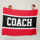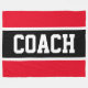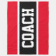 Starke, fette Buchstaben in einem schwarzen Streifen mit weißem Pinstreifen auf einem hellroten Hintergrund, wobei "COACH" vorn und mittig geschrieben wurde. Der Text kann personalisiert sein.