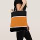 Dieses sportliche Design besticht durch einen hellen, warmen, orangefarbenen, breiten Mittelstreifen, der mit schlanken, weißen Streifen auf schwarzem Hintergrund hervorgehoben wurde.