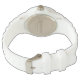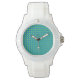 Eine schicke, weiße Sporty Wrist Armbanduhr mit einem Polka Dot Muster in blauen, smaragdgrünen und neongrünen Farben. Teil der Posh & Painterly 'Blue Moons' Kollektion; von Judy Adamson aus einer handbemalten Papierkollektion.
