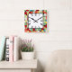10,75" x 10,75" quadratische Wanduhr mit lustigen Retrobildern von roten, orangen, gelben, grünen und blauen Flecken auf schwarz und einer römischen numerischen Uhr in einem weißen Quadrat mit einer schwarzen Grenze. Sehen Sie sich die gesamte Sammlung der Nifty 50er Clock im DECOR an. | Uhrenabschnitt. Dieses Produkt ist nicht mit dem ursprünglichen Urheberrechtsinhaber verbunden oder verbunden.