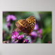 A butterfly with intricate patterns on its wings perches delicately on a vibrant purple flower, surrounded by lush green foliage. The scene captures the delicate interaction between the butterfly and the blooming flora in a moment of natural beauty.