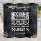 Diese Grafik zeigt eine humorvolle Warnung für jeden um einen Mechaniker, Set vor einem dunklen, industriellen Diamantboden. Der fette weiße Text, hervorgehoben durch Hazard-Dreiecke und Schraubensymbole, lautet: "MECHANIC WARNING FLYING TOOLS AND OFFENSIVE SPRACHE WAHRSCHEINLICH". Dieses Design spiegelt die intensive und oft flüchtige Umgebung eines geschäftigen Auto-Shops wider, der sich perfekt für mechanische Bekleidung oder Dekoration eignet.