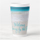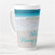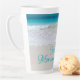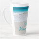 Große Tasse mit Strandszene und Sprichwort. Beispieltext, in zwei Zeilen lautet: "Willkommen Morgen am Meer" in blauem Schrift, über glattem Sand gedruckt. Verändern Sie es einfach zu dem, was Sie wollen. Türkisblaues Wasser in der Ferne und kleine Wellen am Ufer machen dies zum perfekten Strandhaus Tasse.
