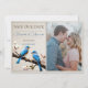 Personalisieren Sie eine charmante Hochzeitsankündigung mit einem Spring Bluebirds Foto Save the Date. Das Design der Ankündigung besteht aus einem Paar Bluebirds, die auf einem Holzzweig ruhen, mit Federblüten vor einem texturierten Hintergrund aus Papier. Zusätzliche Ankündigung Datum freihalten für dieses Design in verschiedenen Farben verfügbar.