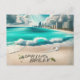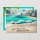 An einem Sandstrand stürzen sich die hellen Wellen, und die "Spring Break" ist in den Sand geätzt, an tropischen Blume entlang und ein Palmenblatt für ein Reisebüro.