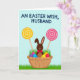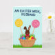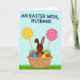 This card shows a stylized brown bunny with long ears rising from a light tan woven basket, wearing a small red bow tie that adds a sweet, friendly touch 🐰. The basket is filled with glossy egg shapes in magenta, blue, purple, and golden yellow, tucked into sprigs of bright green grass. On both sides, two oversized round swirl candies stand upright on slim cream-colored sticks, like cheerful signposts framing the bunny. One swirl is sunny yellow and the other is soft pink, and their gentle curves echo a cozy, affectionate mood between the elements, as if the scene is arranged for someone special. The background is a calm light blue that keeps everything airy and open, like a clear spring morning. Across the top, a short greeting appears in large blue letters, centered and easy to read, with no other words competing for attention 🌷. Along the bottom edge, a strip of green grass runs horizontally, grounding the basket and treats against the sky-blue backdrop.