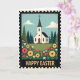 This greeting card shows a spring countryside scene framed like an old postage stamp with tiny edge notches and a lightly worn texture. In the center sits a small white chapel with a dark steeple topped by a cross, and a red front door that feels like an open invitation for friends to step inside together. Deep green evergreen trees cluster around it, set against a calm blue sky with rounded, soft clouds. The foreground is a rolling meadow packed with big golden-yellow blooms, coral-red flowers, and small white star-shaped blossoms, with extra pink and orange touches scattered between 🌷. The colors are bright but gently muted, giving the scene a cozy, affectionate look, as if the landscape is leaning in to welcome you 🐇. Near the bottom, the words “HAPPY EASTER” sit centered in large golden letters with a slightly grainy texture. The chapel’s red door stands out beneath the steeple, framed by flowers that crowd the lower edge like a natural border.
