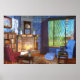 Eine gemütliche Leseecke an einem sonnigen Frühlingstag. Durch die Gitterfenster strömt warmes Sonnenlicht herein, verlasse Schatten an der Wand und beleuchtet die Kirschblüte "Schneeglobe" im Regal. Im Fenster ist ein bunter Suncatcher funkelnd im Licht. Rund um den Saal stehen bequeme Sessel mit Vasen aus Blume und Büchern und ein Dampfbad, aber die Fenster sind offen, um in der Frühjahrsbrise lassen. Außerhalb einer federgrünen Weide und Buche Hecke und roten japanischen Ahorn umgeben von Tulpen und Maisblumen, während eine Ingwer Katze durch das lange Gras streift.