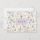 Hübsche Hochzeitskarte mit schönen Frühlingsblumen in Lavendeltönen, blau, rosa und gelb. Lila Bereich für Ihren Text. Reverse ist eine elegante Lavendelfarbe mit schönen Blume-Stammakzenten. Personalisieren Sie mit Ihrem Datum, Mahlzeiten und Annahme/Verweigerung.