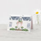 Easter Card has a watercolor house with an easter basket on the front porch. The back has a couple windows adorned with climbing roses. Colors used include olive green, pink, grey, and brown. A pink banner above the door reads "Happy Easter." Inside has text that says "Happy Easter from our house to yours with a place to personalize with a name.