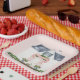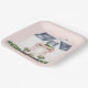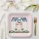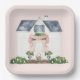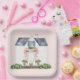 This paper plate design has a watercolor front door with an easter basket on the front porch. The back has a couple windows adorned with climbing roses. Colors used include olive green, pink, grey, and brown. A pink banner above the door reads "Happy Easter."