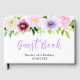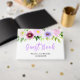This fun and whimsical birthday party guest book features watercolor purple flowers and foliage on a gold geometric frame. The text combines handwritten script and serif fonts for a stylish and modern look. This is perfect for a spring or summer rustic birthday party.