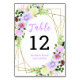 This beautiful and elegant wedding table number sign features watercolor purple flowers and foliage on a gold geometric frame. The text combines handwritten script and serif fonts for a stylish and modern look. This is perfect for a spring rustic wedding.