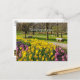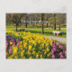 Thinking of you postcard featuring a foto of an early spring season morning walk along a garden full of pink and purple hyacinths and orange daffodils. The early morning sun is shining on them making them glow. Auf Bench in the background is the perfekt spot to sit, rest and enjoy the flowers. Looking for more prints or products? Feel free to visit my store: http://www.zazzle.com/timelessmomentsphtgy This foto was taken by Jennifer White with Timeless Momente Fotogray All images are copyrighted © Timeless Momente Fotografie.