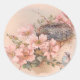 Weich rosa Frühlingsthema mit hübschen wilden Rose, die einen nächsten und kleinen Vogel, der auf einem Zweig nah durch sitzt.