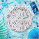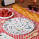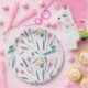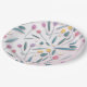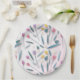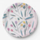 Schöne Frühlingspapier-Teller mit farbenfrohen Tulpen, Gänseblümchen und weißem Hintergrund mit aquamarinen Markierungen. Entsprechende Thementabellware finden Sie unter Speicher.