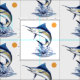 Ein Bild des schönen Springenspeerfisches wird auf diesem bunten Gewebe gekennzeichnet. Es inspiriert eine endlose Vielzahl von Projekten, um ein an die glücklichen Sommertage zu erinnern, die auf dem Strand oder den Zeiten tollen in den Inseln verbracht werden.