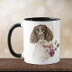 Ein Porträt eines wunderschönen, leberbraunen und weißen Springer Spaniel Hundes liegt direkt hinter einem hübschen Blumenstrauß im Winter auf dieser Tasse. Hinter dem Bild befindet sich ein Schwirl von Imitaten Gold Glitzer. Das Bild wird zweimal auf der Tasse gedruckt, mit Ihrem individuelle Name oder einem anderen Text dazwischen.