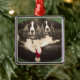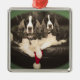 Eine quadratische gerahmte Weihnachtsverzierung, eine ursprüngliche Fotografie der Leber zwei u. der weißen englischer Springer-Spaniels kennzeichnend, die zusammen mit einer Weihnachtsmannmütze sitzen.
