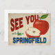 Eine bezaubernde Springfield Missouri Vintage Reise-Postkarte mit einem schönen roten Apfel, zusammen mit lustigen Retro-Text, der sagt: "See you in Springfield"