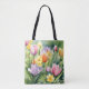 This tote is colorful and cheerful it celebrates early spring with the tips and other flowers the design is watercolor and the tulips are at full bloom.