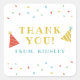 Ein festlicher Kindergeburtstag-Gastgeschenk-Aufkleber mit Regenbogensprinklen und handgezeichneten Party-Hüten und individuell definierbaren Namen und Alter.