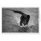 Ein kleiner schwarzer Hund eilt nach einem Stock durch einen Bach.