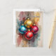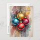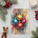 An der Vorderseite stehen vier reich farbene Weihnachtsschmuck - Gold, Türkis, Rot und Magenta - jedes mit einem knackigen weißen Schneeflockenmuster. Sie sind Set vor einem rustikalen, weiß getünchten Holzhintergrund, der durch eine künstlerische Wasserfarbe mit den entsprechenden Farbtönen schön abgemildert wird und einen handgefertigten, malerischen Effekt erzeugt. Das Design ist elegant mit "Frohen Weihnachten" überzogen und mit einem eigenen Familiennamen fertig. Die Rückseite ist klassisch und praktisch eingerichtet. Es beinhaltet eine herzliche, bearbeitbare Urlaubsbotschaft in einem schönen Script-Schriftart und klare Adressen. Die gesamte Postkarte ist eine visuelle Begrüßung, die gemütlichen, bäuerlichen Charme mit modernem Stil verbindet.