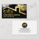 Ein schwarzes Cover weist einen goldenen Rahmen auf, der mit Imitaten überzogen ist und mit einer Zuhause überzogen ist. Unter dem Dach befindet sich ein vergoldetes Handyman-Tool, das neben dem Firmennamen "ZUHAUSE REPAIR SERVICE" und Ihrem Telefonkontakt entworfen wurde. Die Buchstaben hier sind in Imitat Gold. Auf der Oberseite ist ein goldenes Zuhause-Landschaftslogo, das Sie verwenden können. Danach folgen Ihr Name, die Kontaktdaten und eine Slogan-Beschriftung. Eine großartige berufliche Karte für Bauunternehmen und Handwerksbetriebe. #handyman #construction #handymantools #buildingtrading #builder #painter #paintsplatter #homerepair #homerepur #interiordesign #zazzlemade