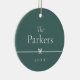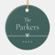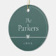 Der süße und einfache Weihnachtsschmuck ist minimalistisch gestaltet, mit Ihrem Familiennamen und dem Jahr in sauberer, klassischer Serifenschrift auf festlichem Fichtengrün. Ein kleiner Bogen durch die Mitte vervollständigt das Design. Fügen Sie der Rückseite ein Foto hinzu.