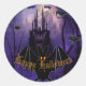 Ein gruseliger lila Halloween-Aufkleber mit einer gruseligen alten Spuk Burg, einer riesigen, fliegenden schwarzen Fledermaus, spukhaften Raben und Spinnen in ihren Netzen. Im Hintergrund dieser unheimlichen Landschaft ist ein großer Vollmond. Die Wörter 'Happy Halloween' können in einen Namen oder in das, was Sie wollen, personalisiert werden.