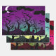 Spuk Halloween-Papier aus dem Friedhof. Ein Spuk Friedhof mit Grabsteinen, sprichwörtlichen Bäumen, einer Hexe, einer Eule und Fledermäusen sind die Elemente dieses coolen Halloween-Designs. Das erste Blatt ist lila und aqua, das zweite in aqua und gelb und das dritte in rot und olivgrün.