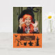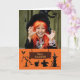 Katzen, Fledermäuse und Hexenhüte sind alle am unteren orangefarbenen Teil der Karte in schwarzer Silhouette zu sehen. Eine Spinne und Fledermäuse werden über dem Foto hängen. Gute Erinnerung der Kostüme des letzten Jahres für den Trick-or-Treater!