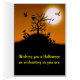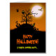 Eine beängstigende Spuk Friedhofszene mit einer Eule, die in einem spukhaften Baum steht und von der auch die Hängematte hängt. Der Hintergrund ist ein orangefarbener Himmel und es gibt einen Vollmond mit Fledermäusen, die darüber fliegen. Sehr lustiges und beängstigendes Design für Ihre Halloween-Grußkarte.