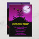 Eine beängstigende Spuk Friedhofszene mit einer Eule, die in einem spukhaften Baum steht und von der auch die Hängematte hängt. Der Hintergrund ist ein dunkel lila Himmel und es gibt einen Vollmond mit Fledermäusen, die darüber fliegen. Sehr lustiges und beängstigendes Design für Ihre Halloween-Party-Einladung.