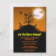 Eine beängstigende Spuk Friedhofszene mit einer Eule, die in einem spukhaften Baum steht und von der auch die Hängematte hängt. Der Hintergrund ist ein orangefarbener Himmel und es gibt einen Vollmond mit Fledermäusen, die darüber fliegen. Sehr lustiges und beängstigendes Design für Ihre Halloween-Party-Einladung.