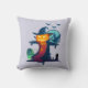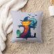 Ein Kissen mit einer coolen Zwischendarstellung. Set auf grauem Lavendelboden. Eine große Kürbisschreie mit einem Kürbiskopf, die einen Hexenhut trägt. Er hat ein bedrohliches Grinsen mit zertäterten Roben und ist in einem Friedhof stehend, wo eine Krähe auf seinem Arm schreit. In der Ferne fliegen Fledermäuse ab, ein Vollmond im Hintergrund und eine einsame Eule mit leuchtenden Augen sitzen auf einem Grabstein.