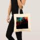 Silhouette eines Spuk Hauses, eines Baumes, eines Friedhofs und einer Hexe, die in einem farbenprächtigen rot-blauen Nachthimmel fliegt.