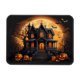 Spuk Haus mit halloween Kürbis und Fledermäusen unter Vollmond, Happy Halloween