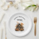 Teller aus Papier mit einer coolen und sprichwörtlichen Abbildung eines Spuk Holzhauses. Umgeben von großen orangefarbenen Kürbissen und Bäumen mit orangefarbenen Blätter. Fenster mit orangefarbenen Lichtern sorgen für ein schönes Licht. Spaß Halloween Design.