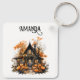 Ein Schlüsselanhänger mit einer coolen und sprichwörtlichen Abbildung eines Spuk Holzhauses. Umgeben von großen orangefarbenen Kürbissen und Bäumen mit orangefarbenen Blätter. Fenster mit orangefarbenen Lichtern sorgen für ein schönes Licht. Spaß Halloween Design.