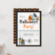 Spuk Haus und Halloween-Elemente kosteten Party Einladung. Es verfügt über ein Spuk Haus, eine Hexe, eine schwarze Katze, eine Spinne, spoky Bäume und Jack O'Lanterns Kürbis. Ihr Text ist in einem weißen Rahmen mit orangefarbener Kontur. Es gibt einen schwarzen Rahmen. Ein Muster aus Kürbis auf schwarzem Hintergrund bedeckt die Rückseite.