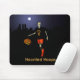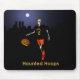 Nicht in Trick oder Behandlung zu Halloween? Wie wär's mit einem kleinen Lieferwagen-Spiel? Ein Skelett, das einen Jack O'Lantern im Basketball treibt. Das Skelett trägt einen T - Shirt mit der Nummer "7" und dem Teamnamen "GHOULS". In der Ferne schwebt der Mond über eine dunkle City-Skyline. Der Text mit "Spuk Hoops" erscheint ebenfalls in orange.