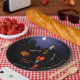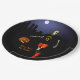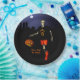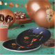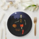 Nicht in Trick oder Behandlung zu Halloween? Wie wär's mit einem kleinen Lieferwagen-Spiel? Ein Skelett, das einen Jack O'Lantern im Basketball treibt. Das Skelett trägt einen T - Shirt mit der Nummer "7" und dem Teamnamen "GHOULS". In der Ferne schwebt der Mond über eine dunkle City-Skyline. Fügen Sie Ihren eigenen Text hinzu.