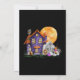 Lade deine Freunde und Lieben dieses Halloween mit diesem farbenfrohen, lila Spuk Haus an einem Mondlichtabend mit einem Grabstein in der Party Einladung des Vorgartens ein.