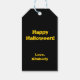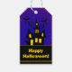 Ein gewagter Halloween-Tag mit einer Spuk Silhouette, leuchtenden Fenstern, fliegenden Fledermäusen und "Happy Halloween"-Text gegen einen lila Nachthimmel. Ideal für Halloween-Party-Gefallen, Süßigkeiten, saisonale Geschenke oder die Ergänzung der Halloween-Touch.