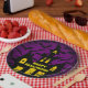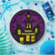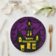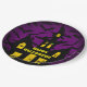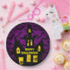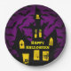 Papier Party Teller zu Halloween mit dem Bild von Fledermäusen gegen einen lila Himmel und ein Spuk Haus mit spukhaften Spinnen, Katzen und anderen beängstigenden Überraschungen.